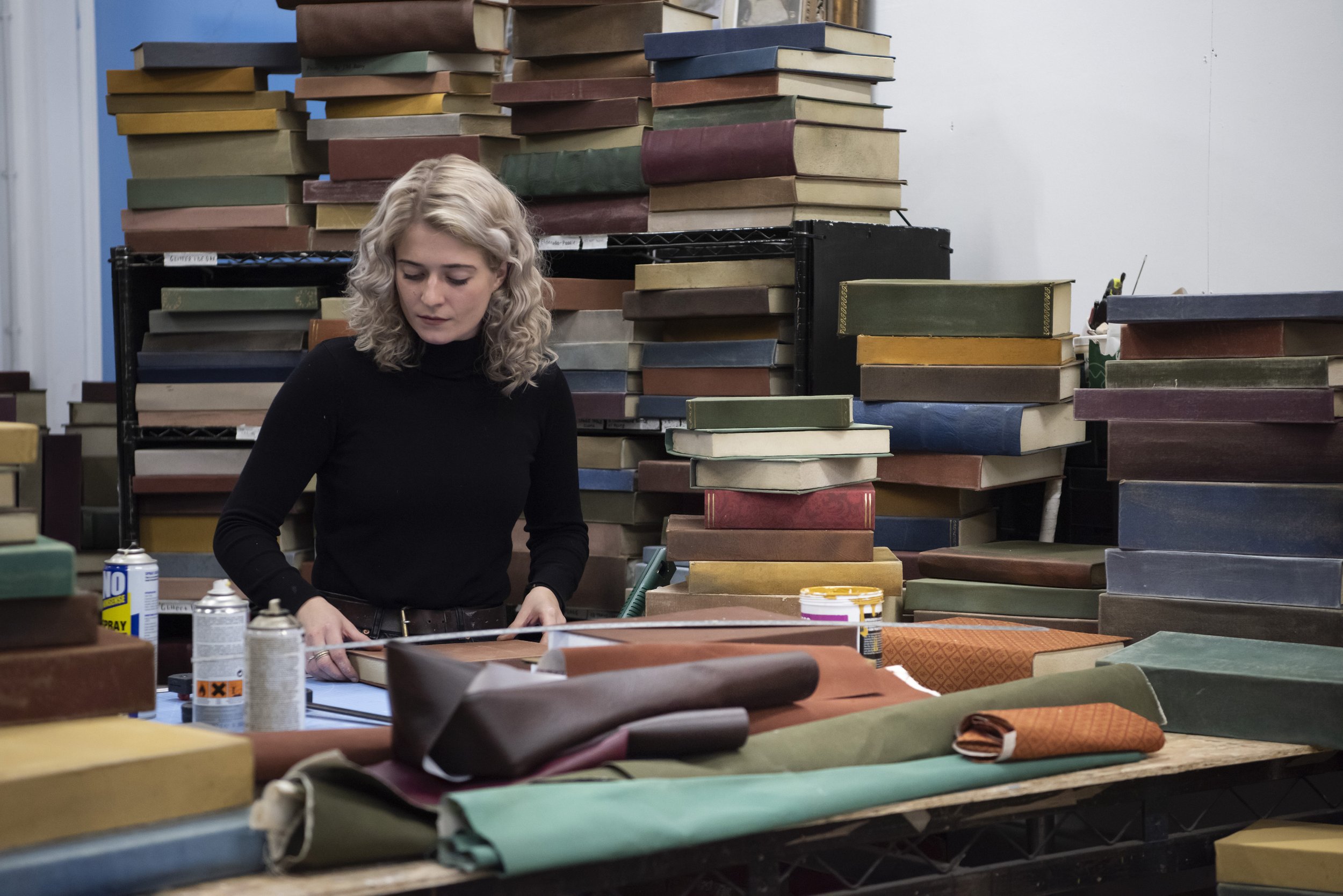For the final show of this triple bill, Gianni Schicchi, we created over 300 fake books to decorate large shelves. We cut polysterene to varying thicknesses and heights. The blocks were then scrimmed and the page texture was created by brushing on Idenden. The page sides were then aged by spraying them with an ochre/grey wash to varying degrees. The covers were then made using thick card and metres of canvas we had pre-painted various colours. For the book spines we added printed designs that had been photoshopped to size and colourmatched to the covers. Other spines were left plain or decorated with gold detail from various stencils. The books were then distressed with a sander and a series of washes.