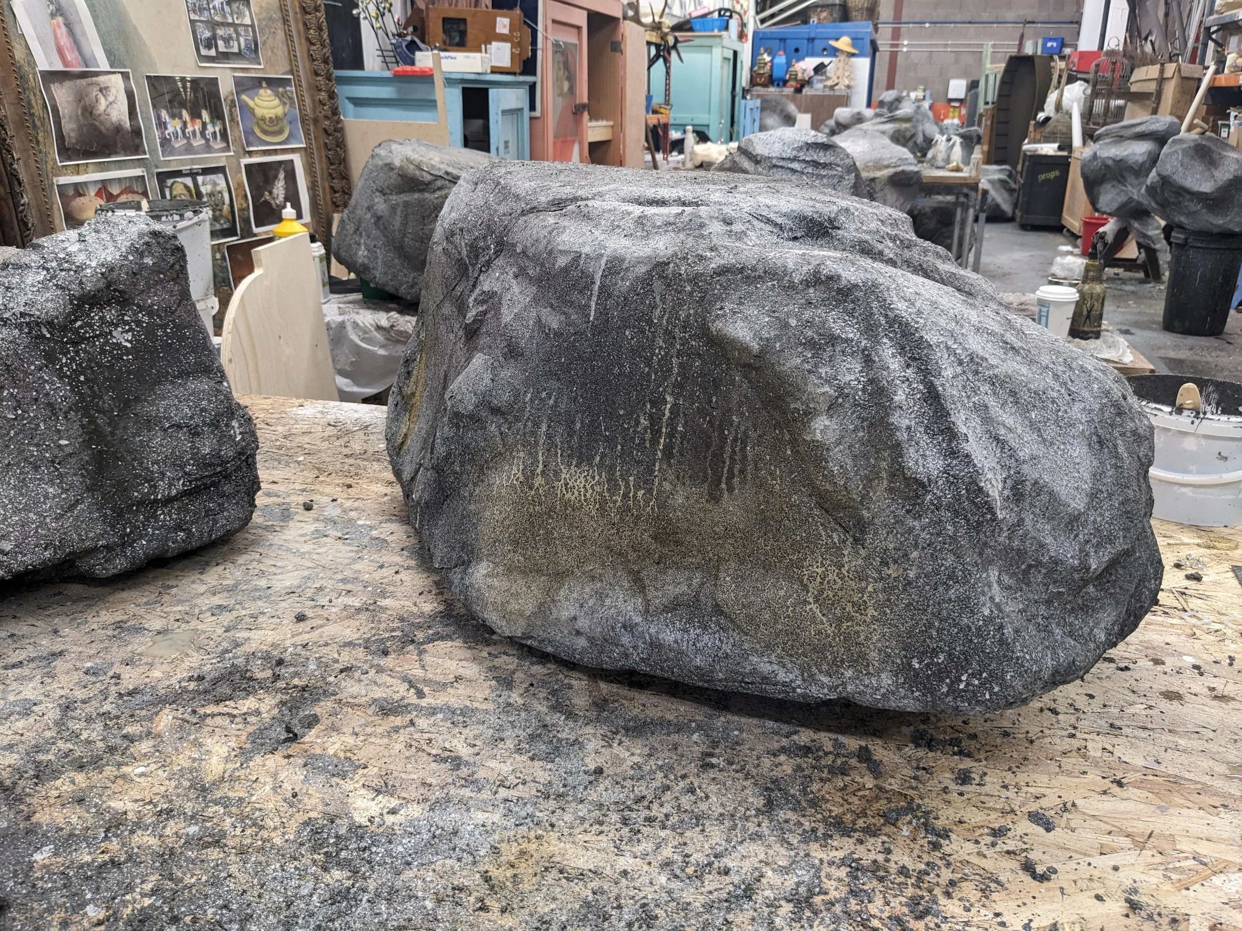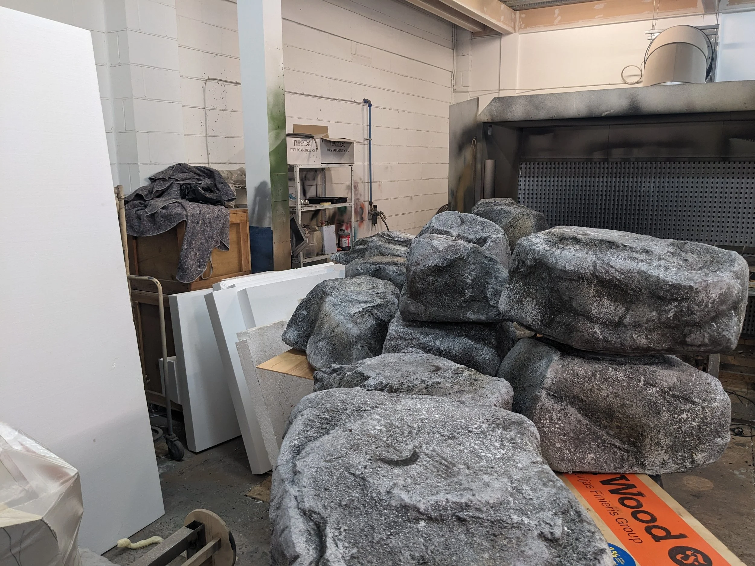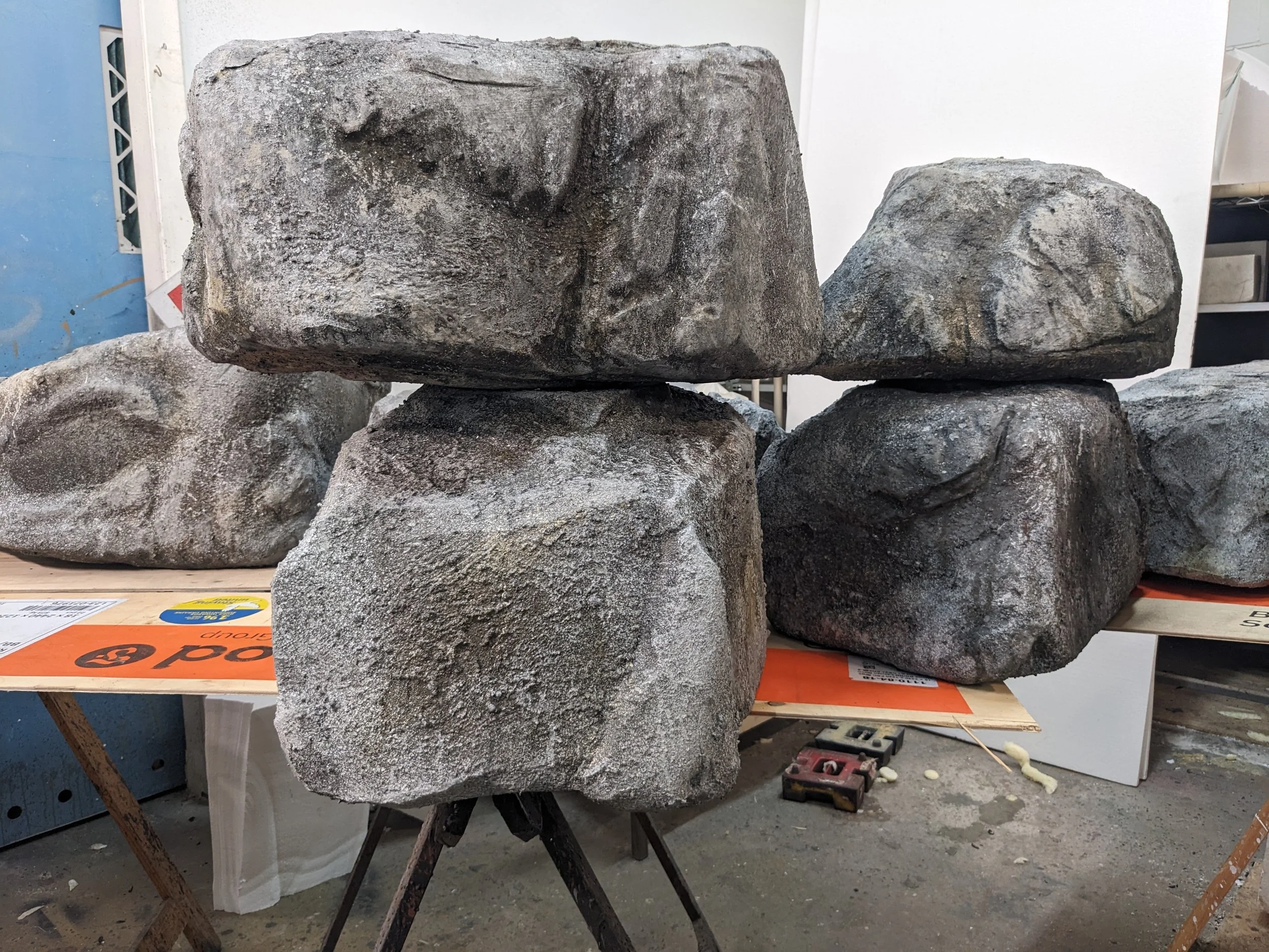 5 of these rocks were carved from polystyrene, scrimmed and painted. The underside was a birch base with felt to enable them to be easily moved on stage. The smaller rocks that had to drop onto the stage from a kabuki drop, were made from Plastazote foam. After assembling a base shape, layers of plastazote were added and carved to shape/ textured using a powerfile. During the performance, the dancers stack the rocks on top of each other. Each rock was fitted with magnets. The underside of the rocks was textured using vermiculite to easily identify the position in which they were stacked. The rocks were then painted with a series of Rosco paint sprays and washes, spattering and a shellac and water effect. Pictograms were then painted onto the rocks using invisible UV paint.
